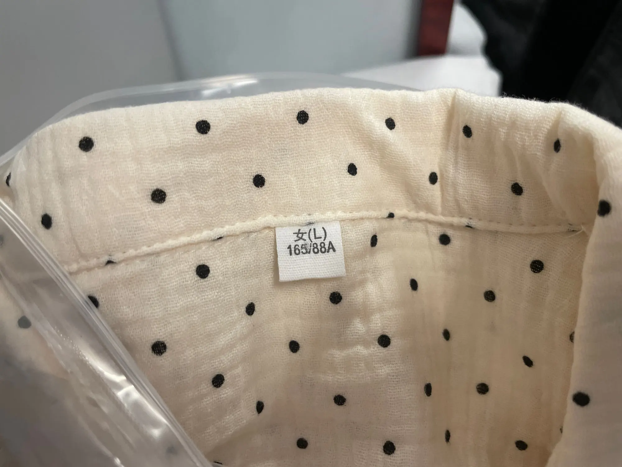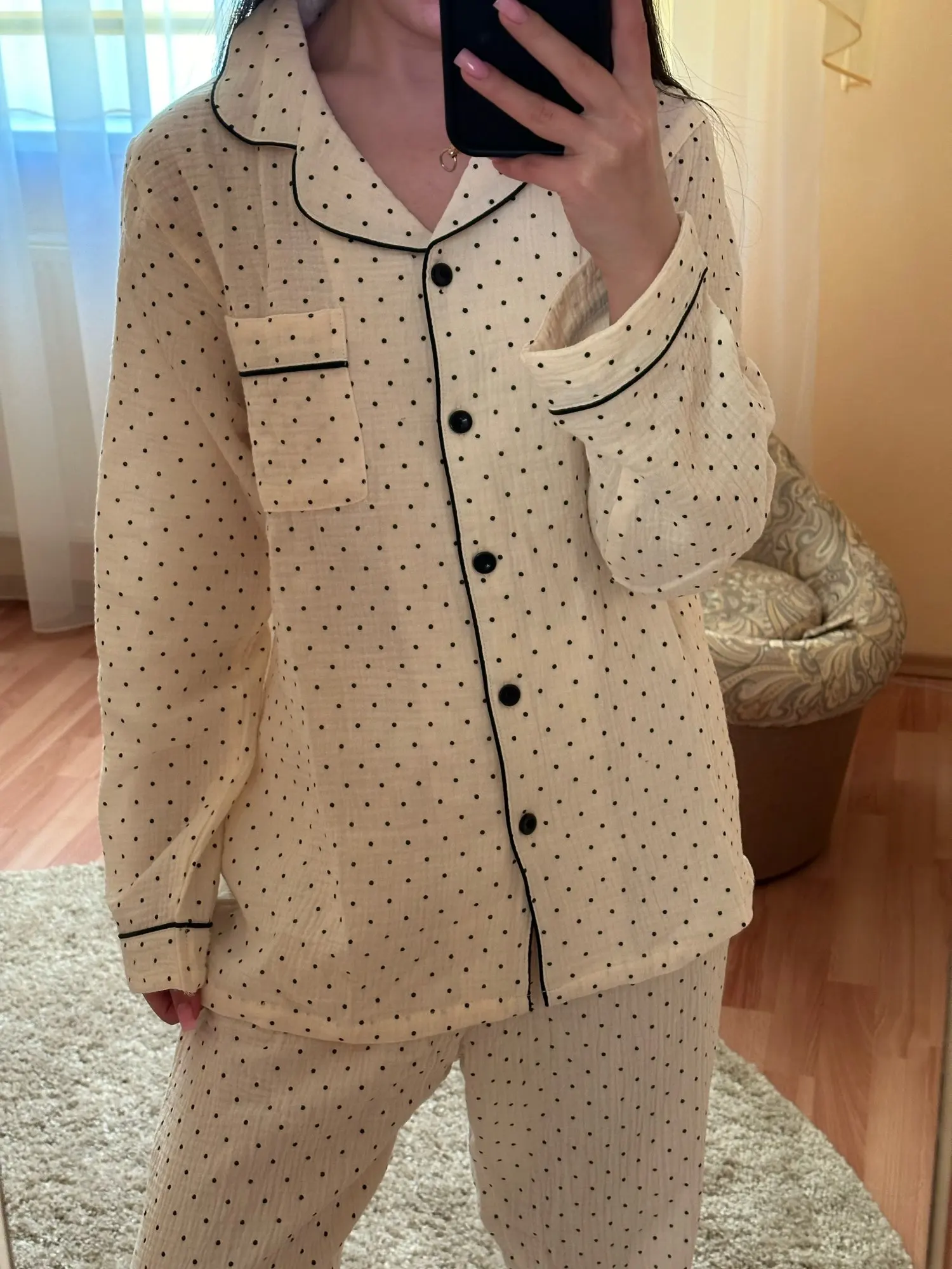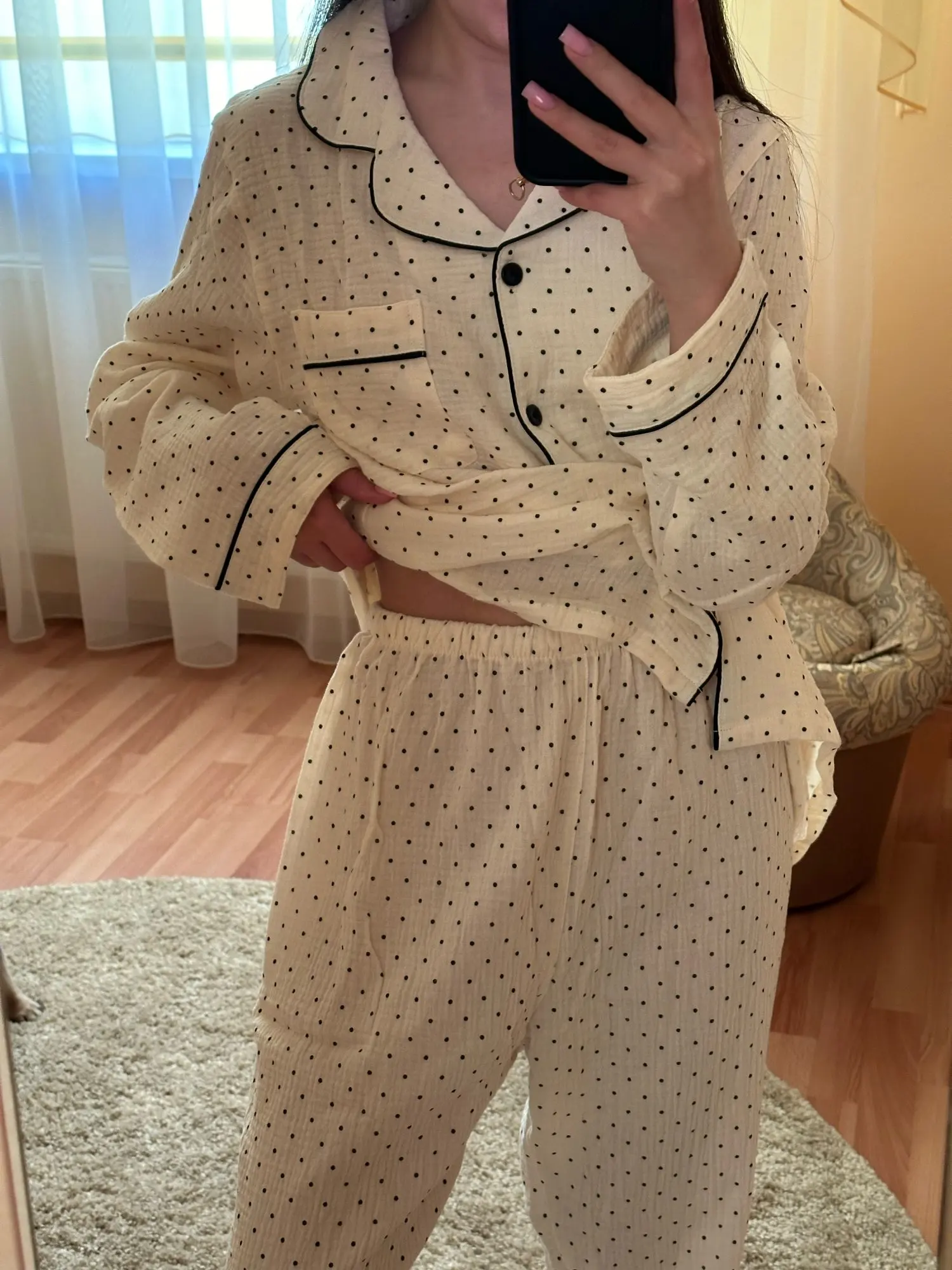 Ensemble pyjama femme en gaze de coton 100% légère et respirante, imprimé pois et coeur, haut confortable et pantalon assorti, tenue de nuit douce et nightwear.