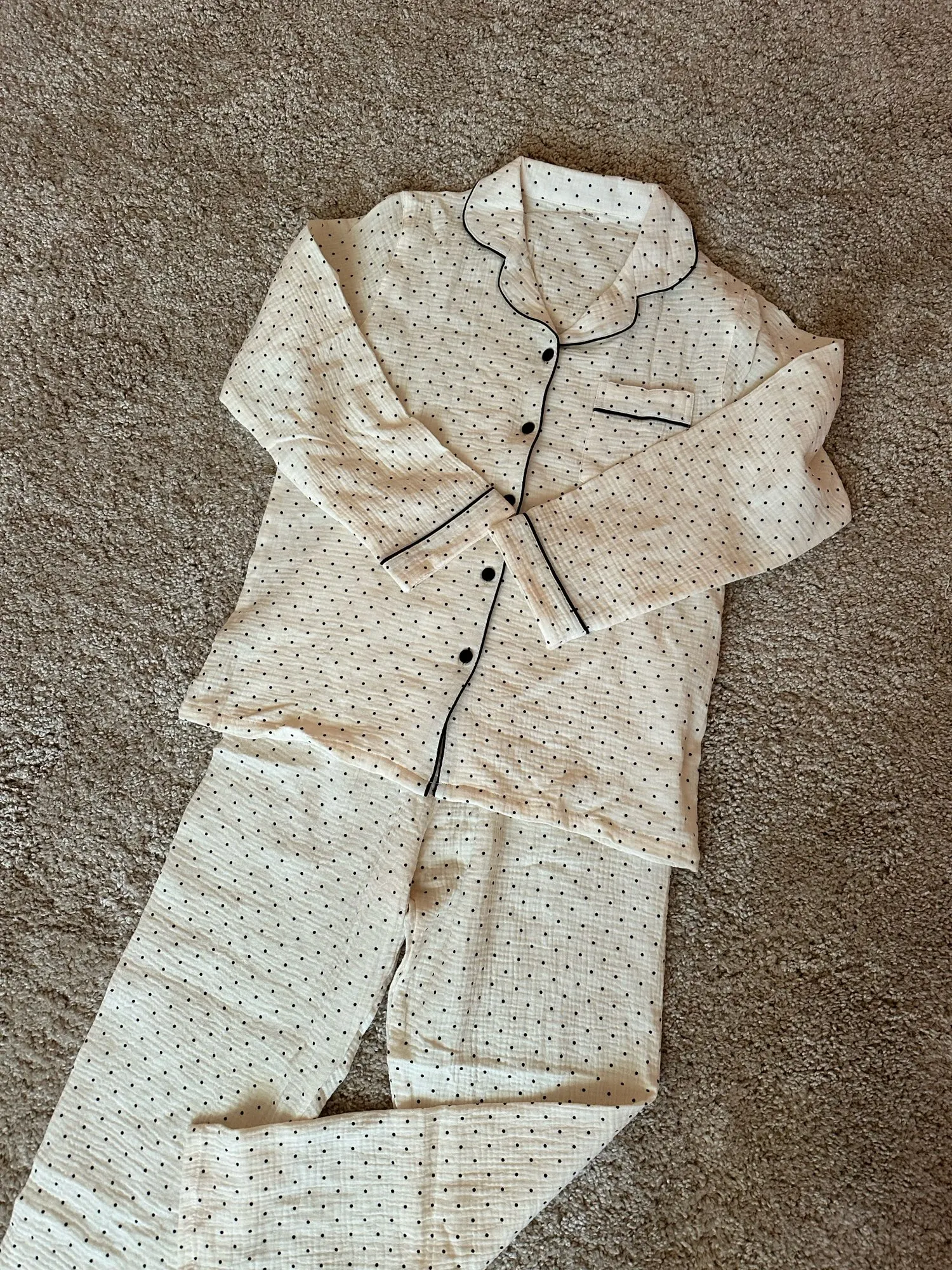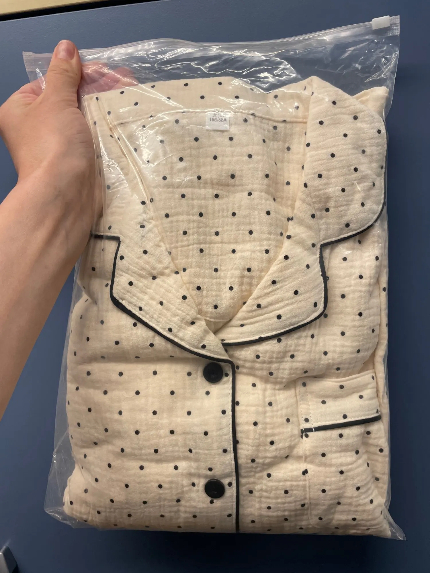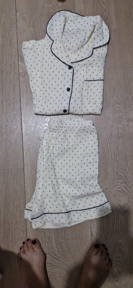 Les pyjamas sont de bonne qualité, le matériau est similaire à de la mousseline. J'ai choisi la taille M pour ma taille XS, et elle me va parfaitement. La livraison a été très rapide, elle est même arrivée plus tôt que prévu. Je suis satisfaite de la commande.