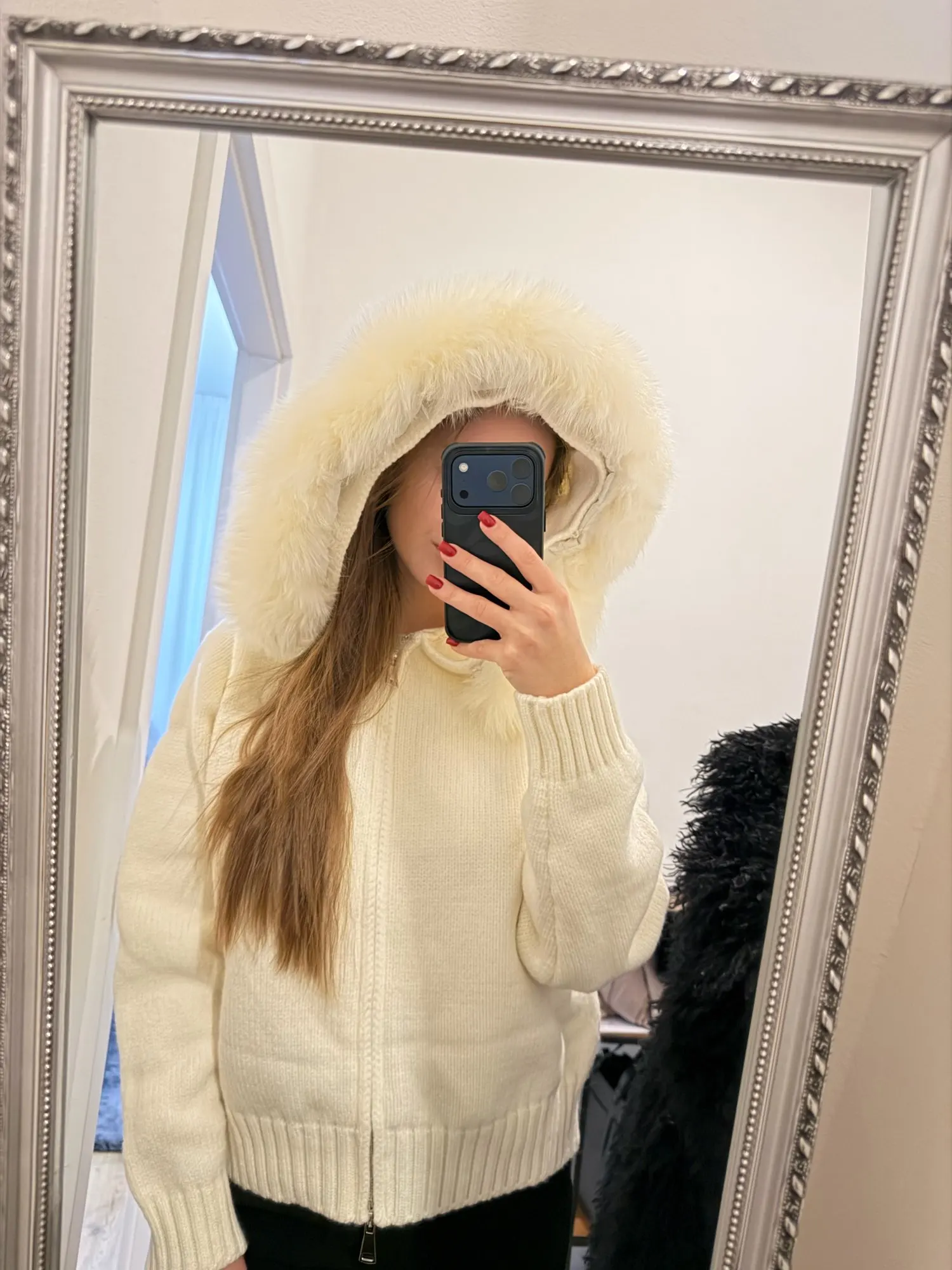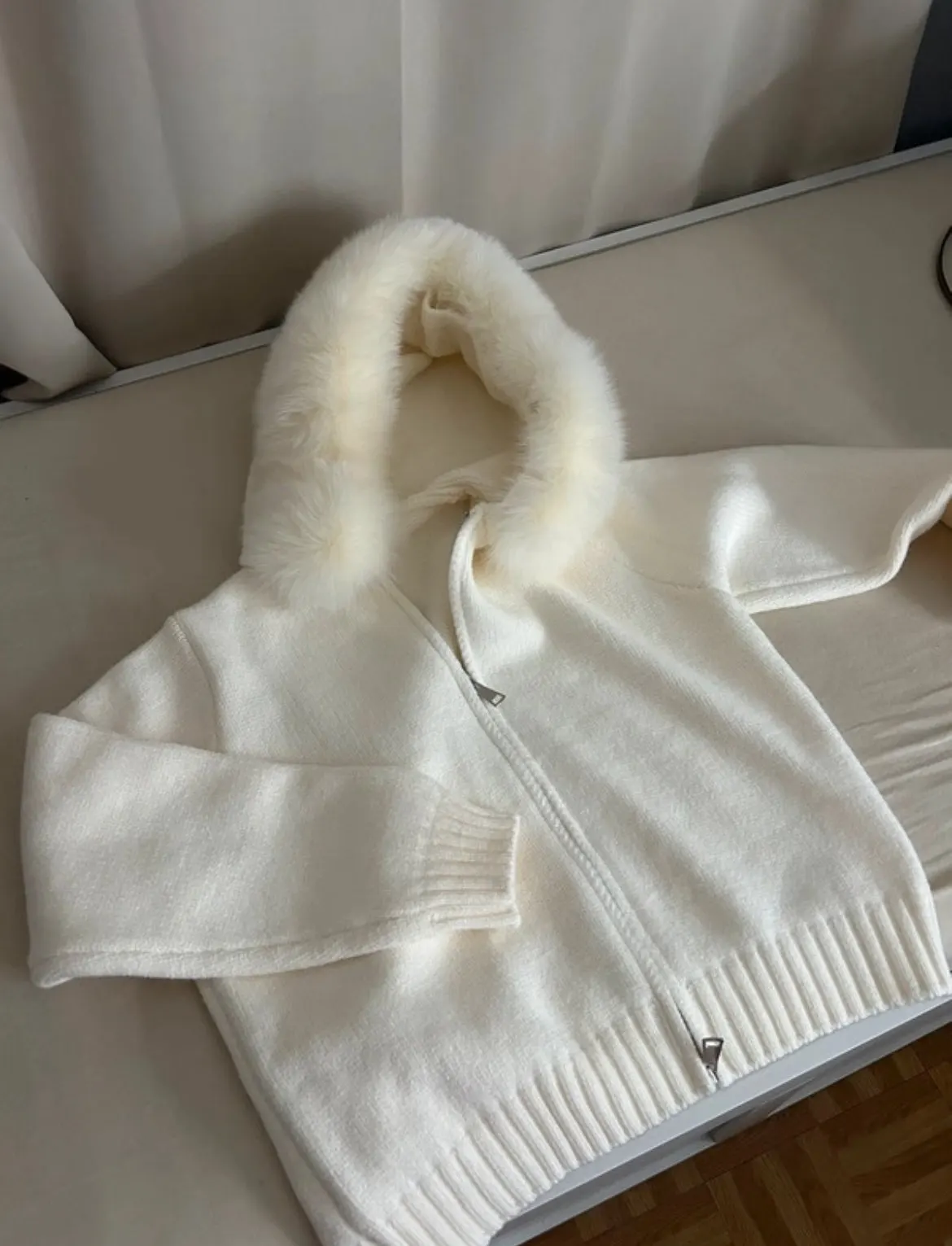 Cardigan à capuche femme pour l’hiver en maille tricotée moelleuse avec fermeture éclair, manches longues côtelées et détails patchwork, idéal comme veste pull chaude et cosy pour la saison froide.